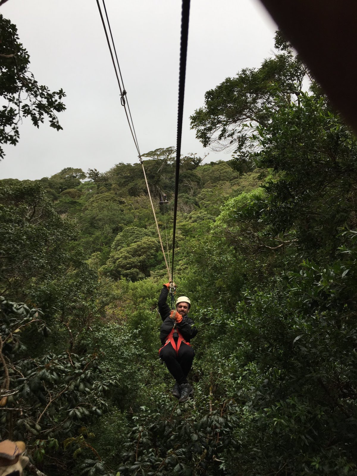 On grimpe à travers des troncs d’arbres gigantesques, on se hisse sur des cordes, on descend en rappel depuis de toutes petites plateformes et… clou du spectacle : nous survolons la forêt en tyrolienne sur plus d’un kilomètre. Quel paysage incroyable ! On aperçoit même le golfe de Nicoya que l’on avait traversé en ferry quelques jours auparavant.