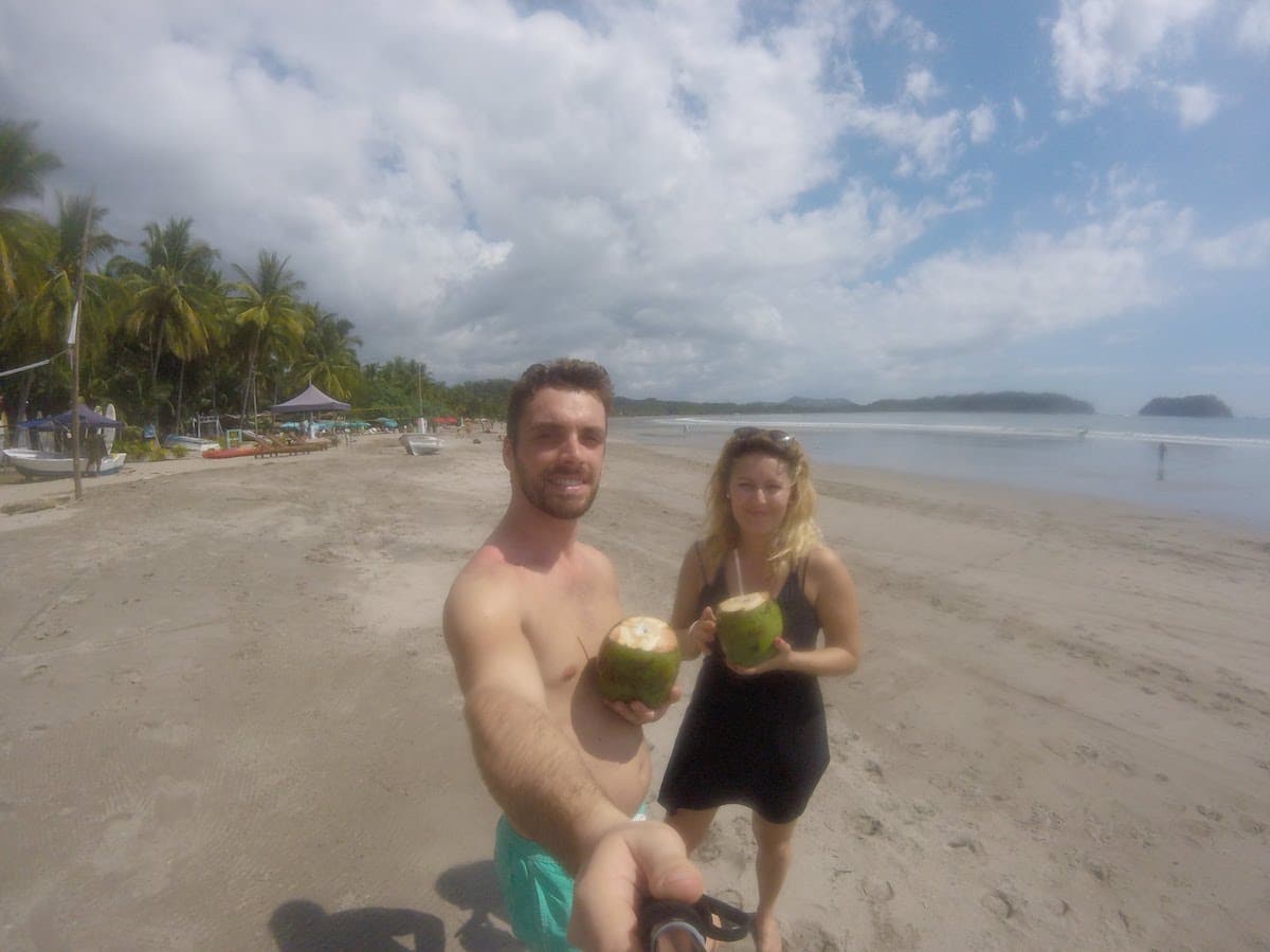 C’est à Sámara que nous prenons notre première leçon de surf ! Bon, pas terrible avec les lentilles de contact mais… quoi de mieux que le jus d’une noix de coco fraîche achetée quelques colones (monnaie locale) à un vendeur ambulant pour se remettre de ses émotions ?