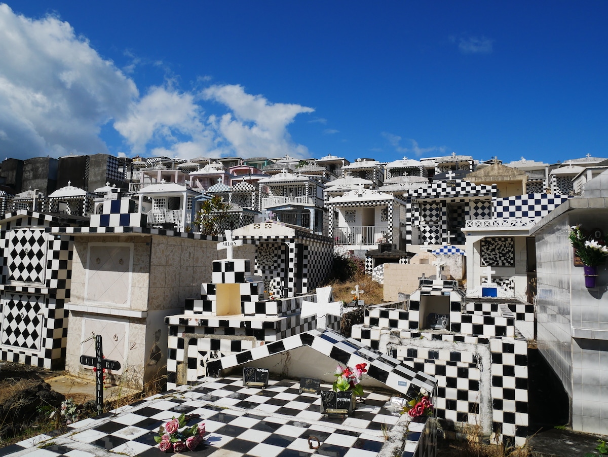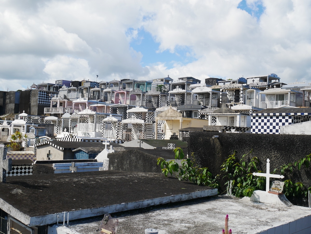 Il n’y avait absolument personne le jour où nous y sommes allés. Tout était silencieux. Les autres cimetières de Guadeloupe se sont inspirés de celui de Morne à l’Eau, ainsi vous aurez l’occasion de voir des damiers sur les sépultures un peu partout sur l’île.